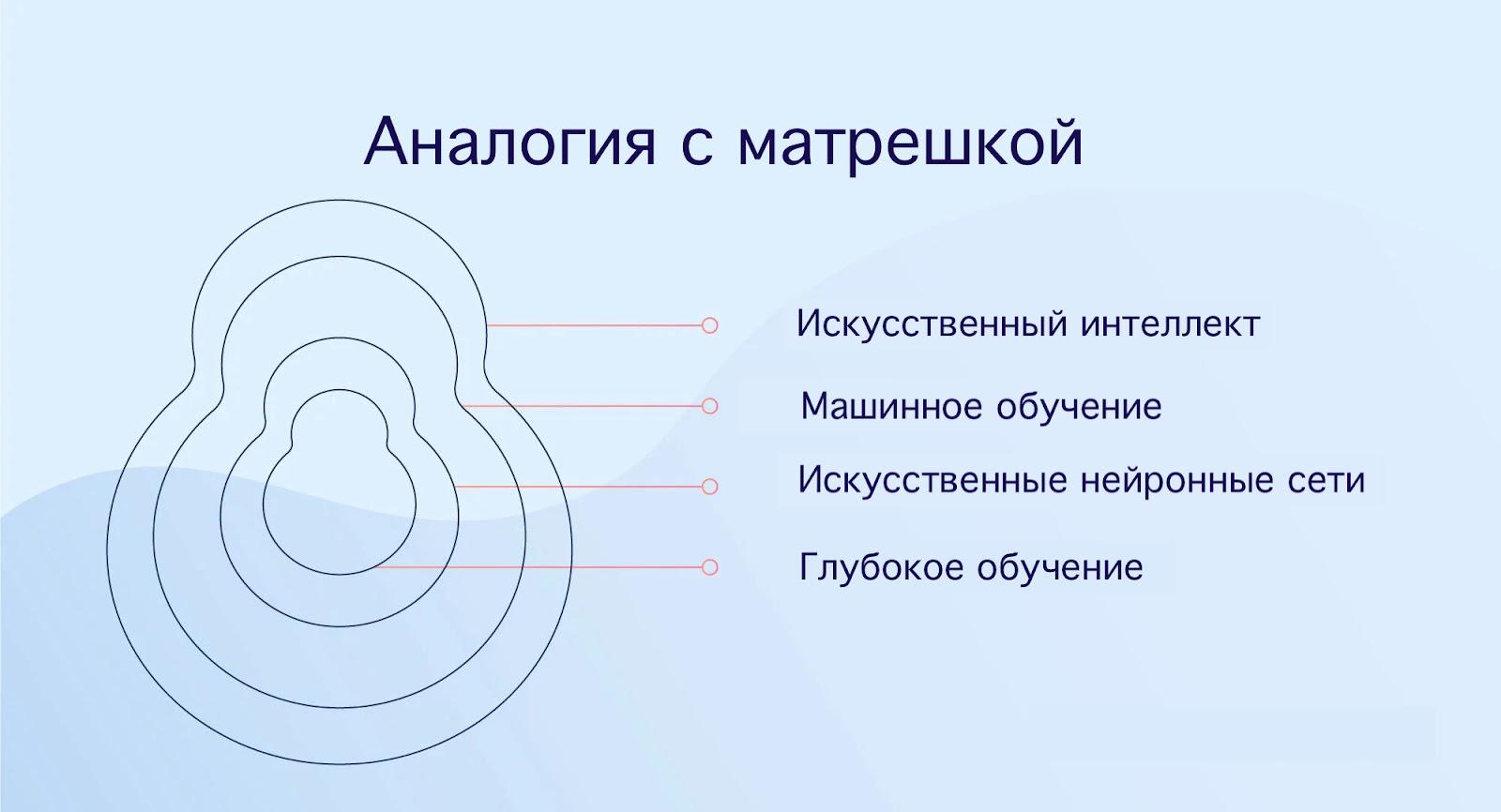 Наша первоначальная аналогия по-прежнему актуальна: не следует рассматривать эти концепции как отдельные элементы, а скорее как матрешку, где ИИ является большой куклой, а машинное обучение, нейронные сети и глубокое обучение — это последующие меньшие куклы.