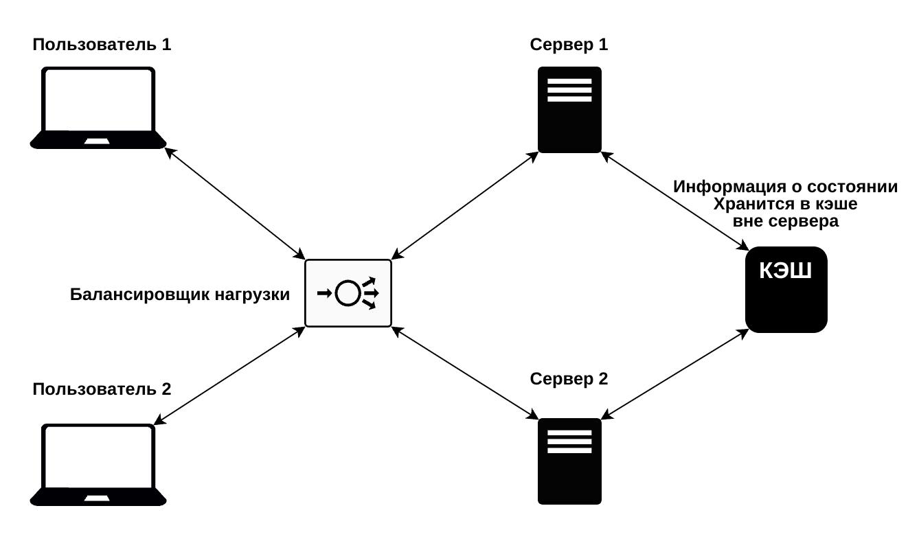 На схеме ниже продемонстрированы два разных пользователя, которые пытаются получить доступ к веб-серверу через балансировщик нагрузки. Так как состояние приложения хранится отдельно от серверов, пользователи могут быть направлены на любой из них. После чего сервер запросит информацию о состоянии из внешней базы данных, которая доступна для всех серверов.