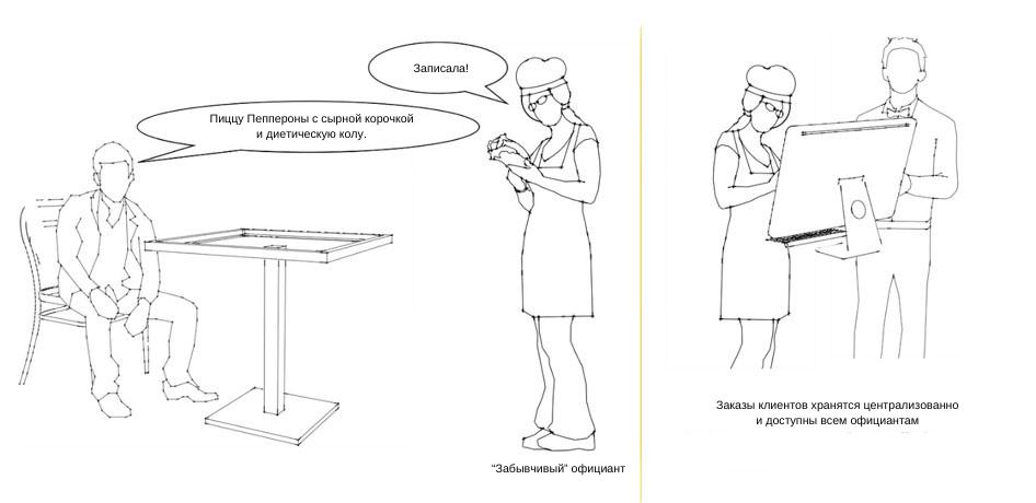 Что будет, если у официанта, который принял у клиента заказ, возникнет ЧП и ему придется уйти? Вся информация по заказу так и останется у этого официанта. Это подрывает качество обслуживания клиентов, так как любой новый официант, который придет, чтобы заменить старого, не будет ничего знать о предыдущих заказах. Такая структура не является отказоустойчивой.