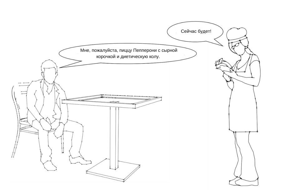 Иллюстрация: «забывчивый» официант принимает заказ, а затем обращается к компьютеру, чтобы получить больше информации о заказе