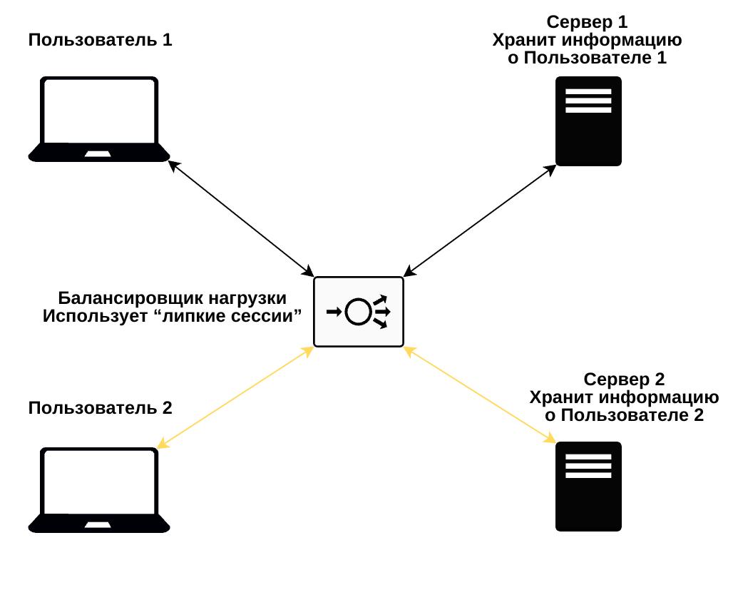 На схеме ниже показаны два разных пользователя, и они оба хотят получить доступ к веб-серверу через балансировщик нагрузки. Так как состояние приложения сохраняется на сервере, пользователи при каждом запросе должны направляться на один и тот же сервер, чтобы сохранять состояние.