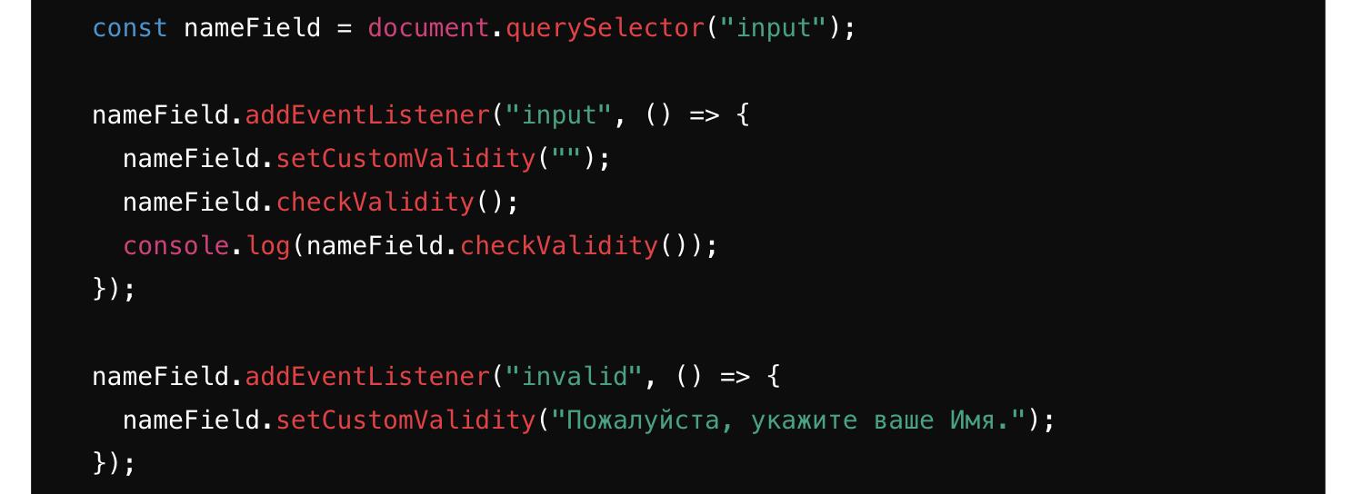 HTML5 Constraint Validation API: Атрибуты required и pattern HTML могут помочь в выполнении базовой валидации. Но если вам нужна более сложная валидация или подробные сообщения об ошибках, вы можете использовать Constraint Validation API.