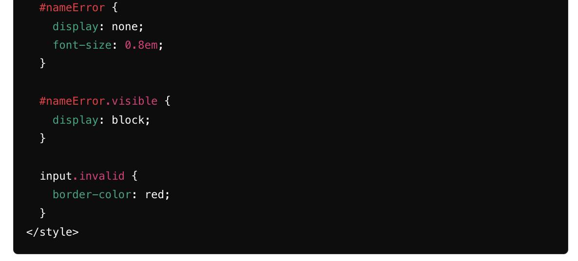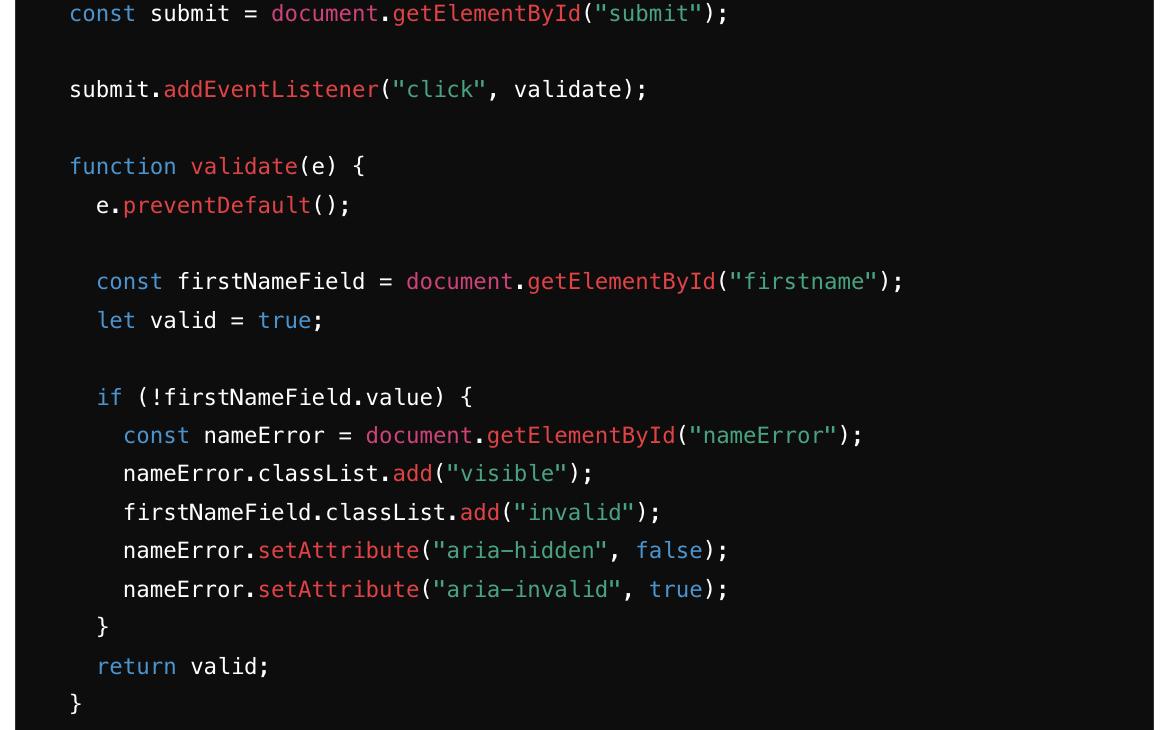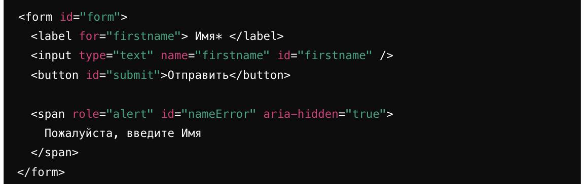 Атрибуты Aria изменяются соответствующим образом для обозначения ошибки. Используя CSS для показа/скрытия ошибки, мы уменьшаем количество манипуляций с DOM. Сообщение об ошибке предоставляется в контексте, что делает пользовательский опыт интуитивным.