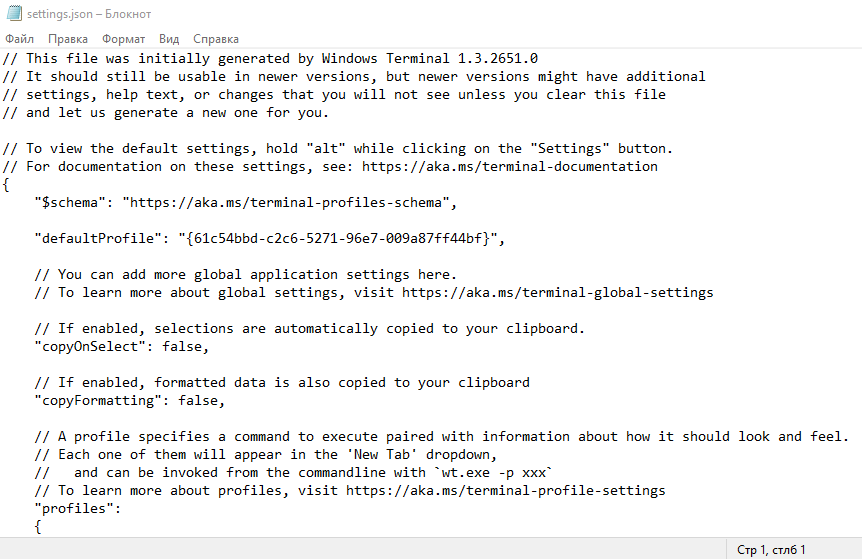 Windows Terminal имеет большое количество настроек, включая цветовые настройки и сочетания клавиш. Чтобы просмотреть настройки по умолчанию, нажмите Ctrl+, или выберите Параметры в меню окна. Файл настроек представляет собой текстовый файл settings.json.